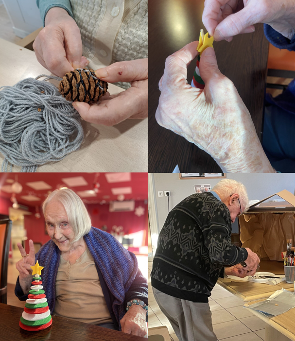 Les ateliers créatifs occupent également une place importante : confection de décorations, réalisation de cartes et créations manuelles permettent aux résidents d’exprimer leur créativité tout en restant acteurs des préparatifs de Noël. Ces moments stimulent à la fois l’attention, la précision des gestes et la coordination, tout en favorisant l’échange et le plaisir de faire ensemble.
